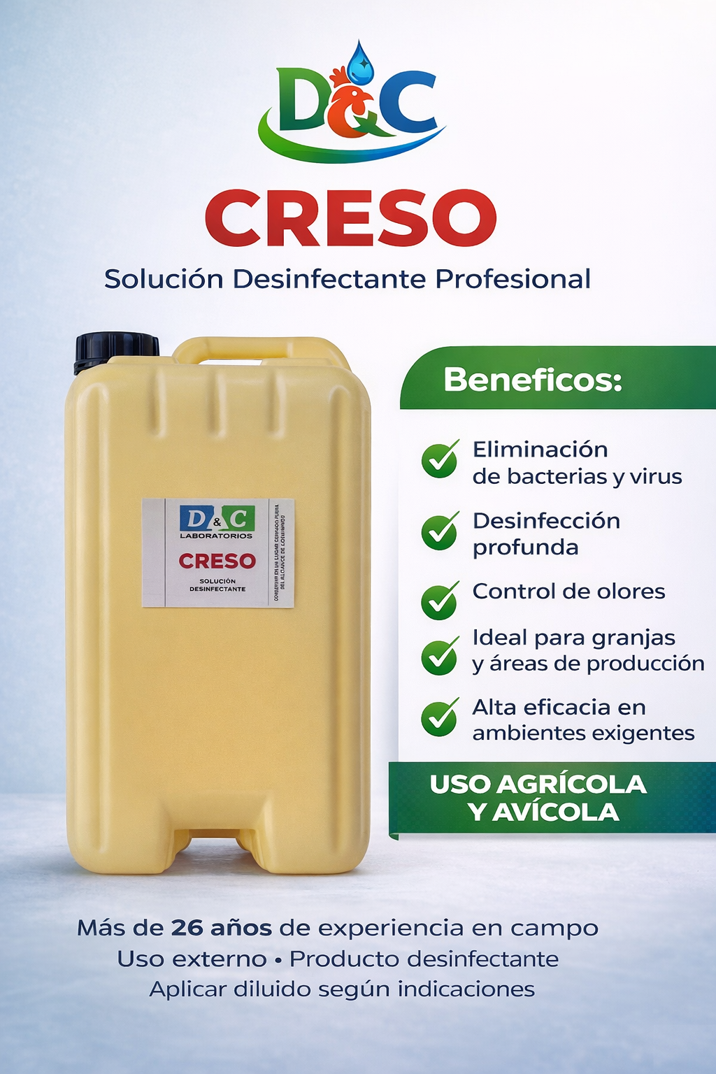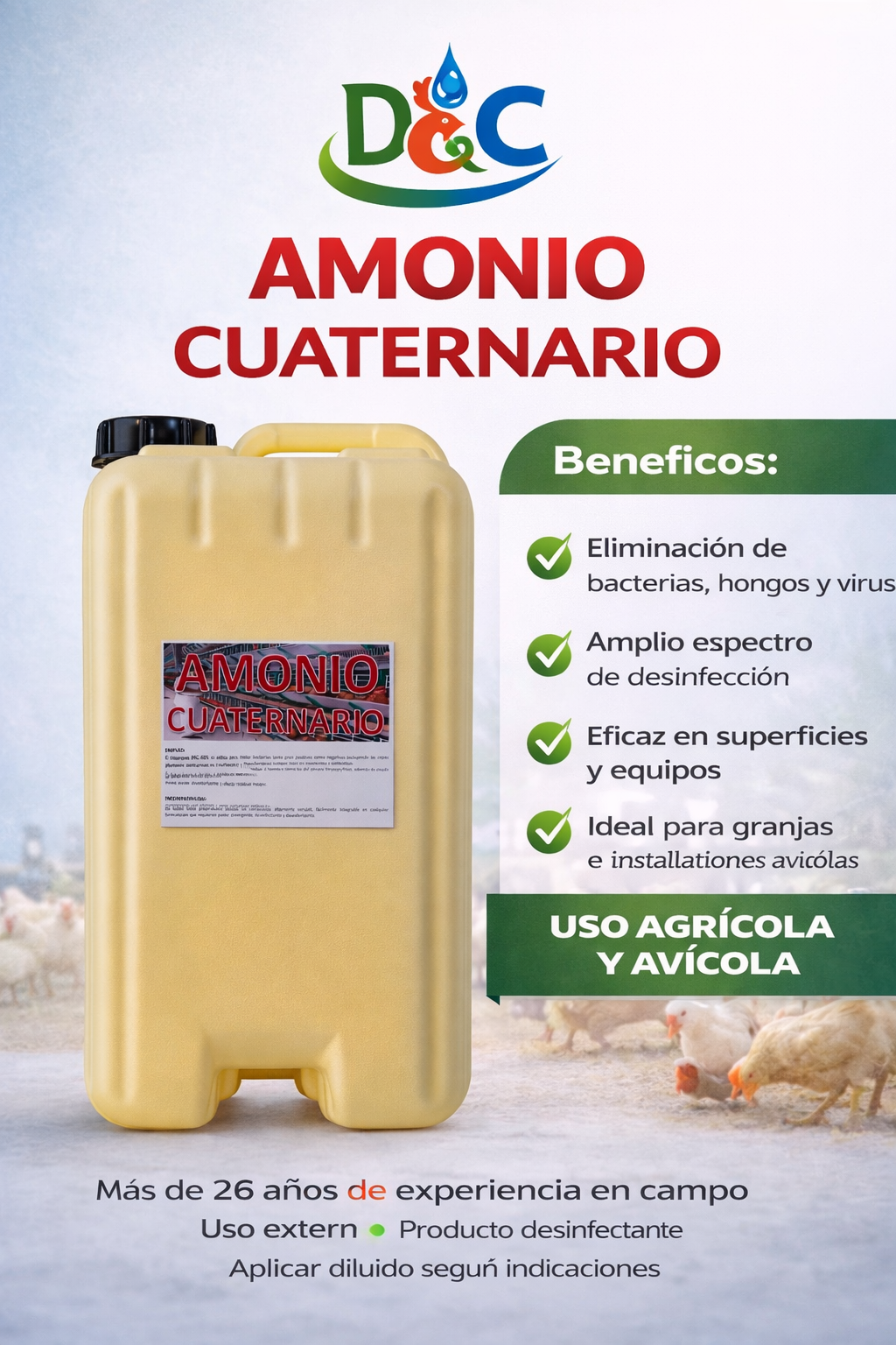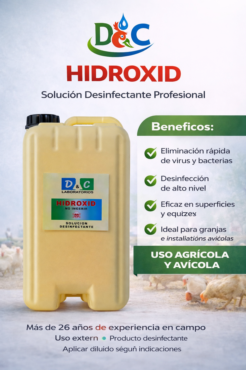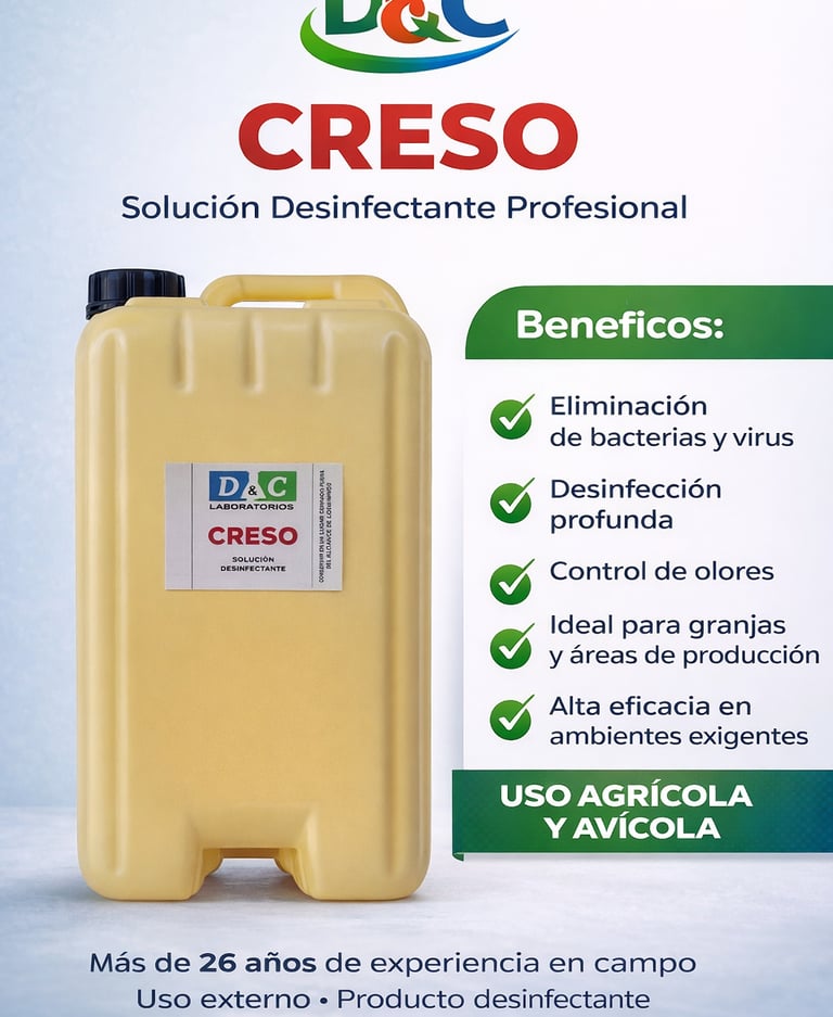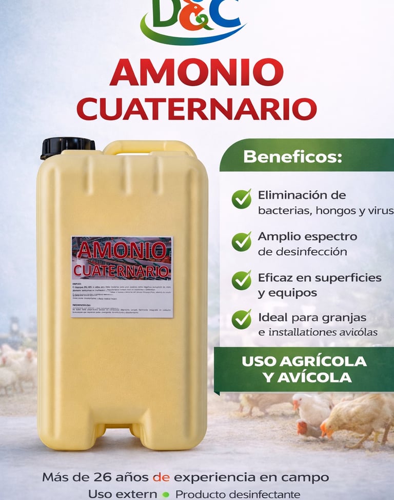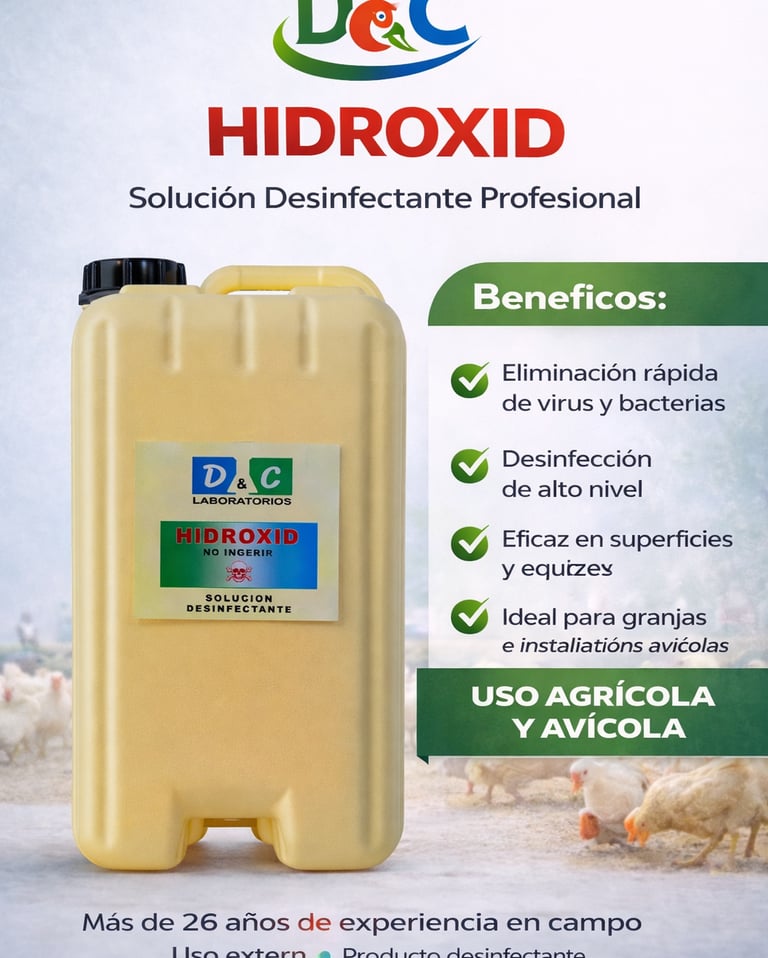 Soluciones desinfectantes de alta eficacia diseñadas para mantener la higiene y bioseguridad en entornos agrícolas, avícolas e industriales. Nuestros productos eliminan bacterias, virus y hongos, ayudando a prevenir enfermedades y garantizar espacios seguros y productivos.